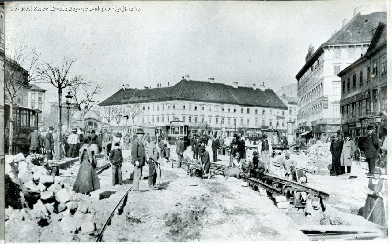 Alsóvezetékes villamos vasúti vágány építése a Károly körúton, 1897-ben