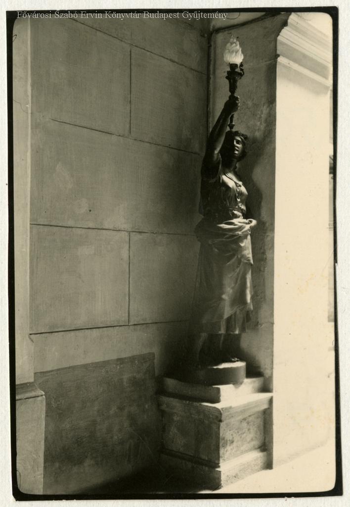 [Női szobor talapzaton kezében fáklyával a Liszt Ferenc tér 6. udvarán]