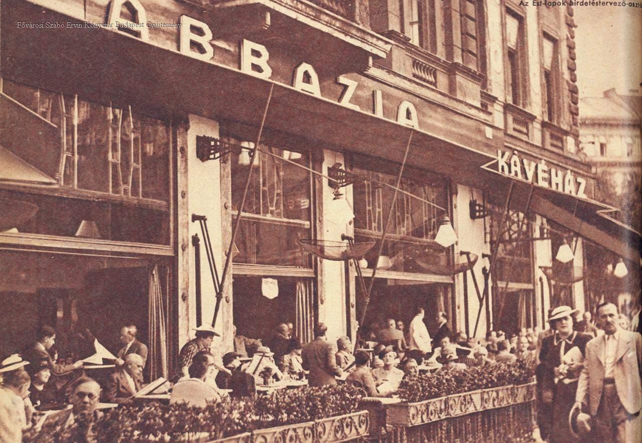 [Az Abbázia kávéház nyári terasza vendégekkel]