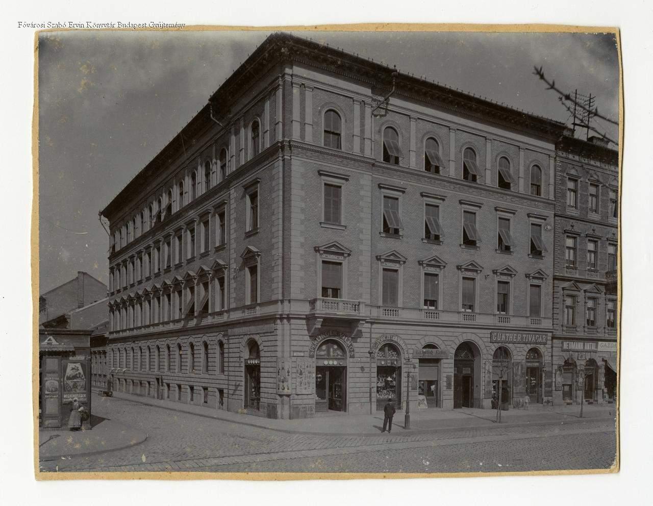 Sarokkép, kis belátással a volt Óriás utcába, az épület melletti házak részleteivel. Cégtáblák:Adler Gyula cukrász (Üllői út 66.), Sperlinger Vilmos üveg- és porcelán raktár, Lustig Ede bőrkereskedése, Günther Tivadar (Üllői út 68.), Neumann Antal kávémérése (Üllői út 70.)