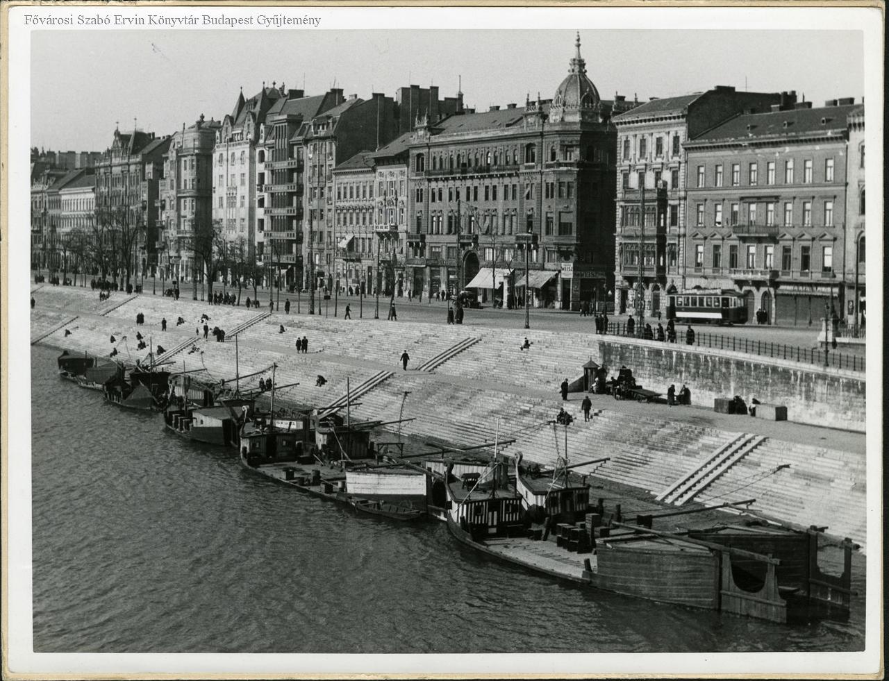 rakpart, lépcső, kikötő, halászati hajó, lakóépület, villamos, 1940