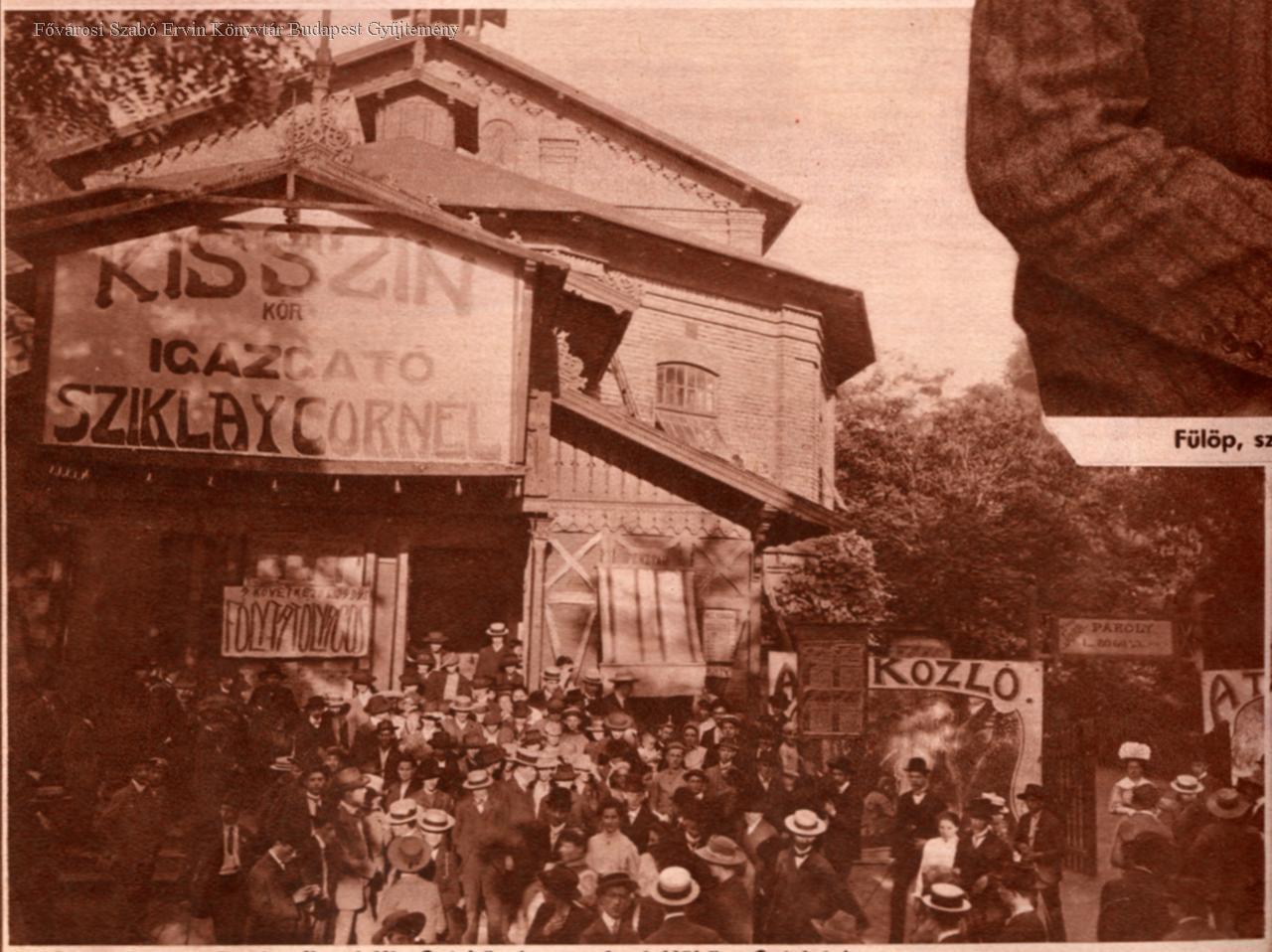 1900-as évek. Az ajtón kitóduló tömeg. Felirat: "Kis színkör, ig. Sziklay Kornél"