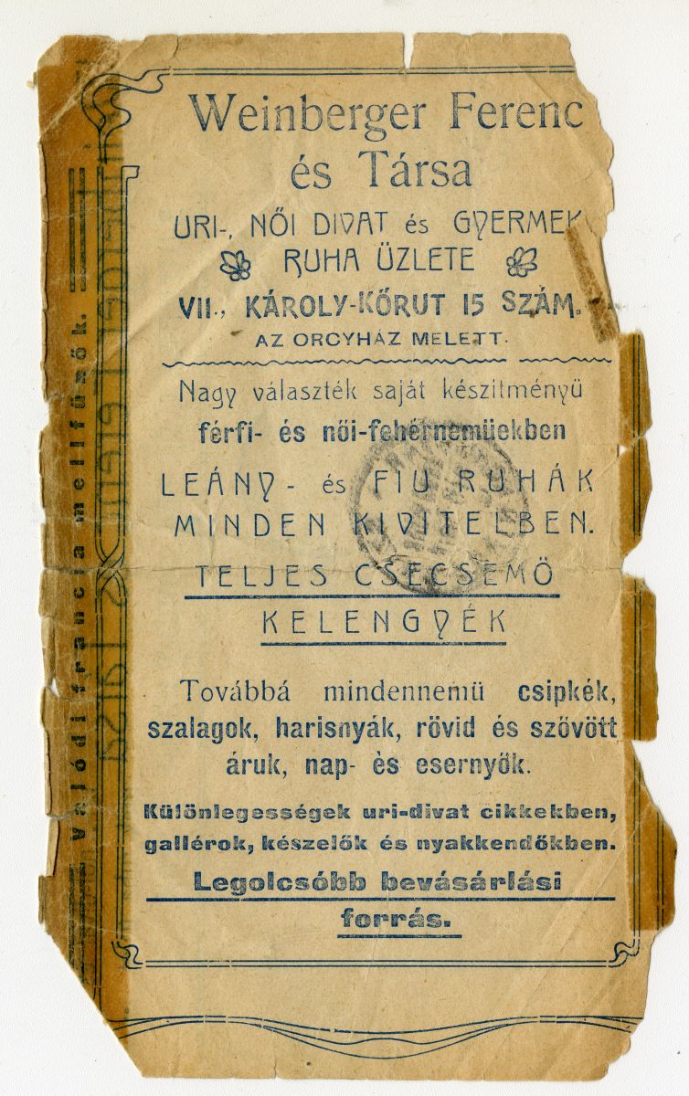 férfidivat, női divat, gyermekruha, ruha, alsóruházat, rövidáru, esernyő, üzlet, reklámnyomtatvány, kisnyomtatvány, aprónyomtatvány, számolócédula