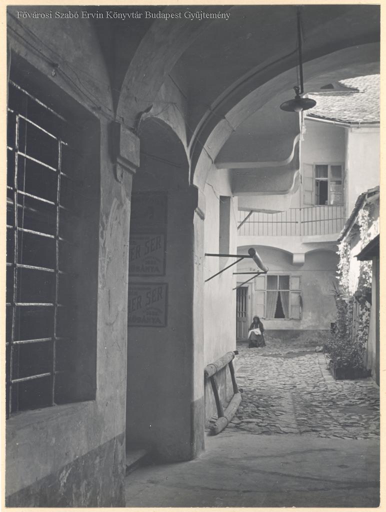 A ház azonosítása kétséges. Belső udvar. Poroló. A háttérben kézimunkázó asszony