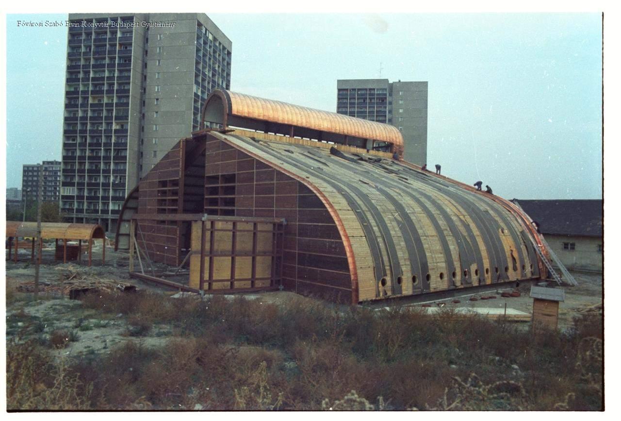 külső felvétel, épületkép, áruház, üzletház, építés, munkagép, 1980-as évek