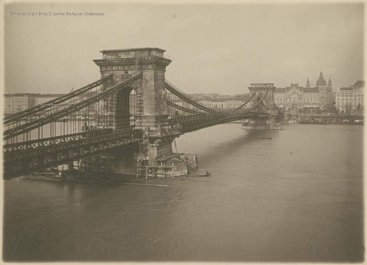 A Lánchíd átépítése, vasszerkezetének megerősítése. Teljes rekonstrukció: 1914. február 3-tól 1915. november 26-ig. Látlép a budai oldal felől, a kép jobb oldalán a Gresham-palota épülete.