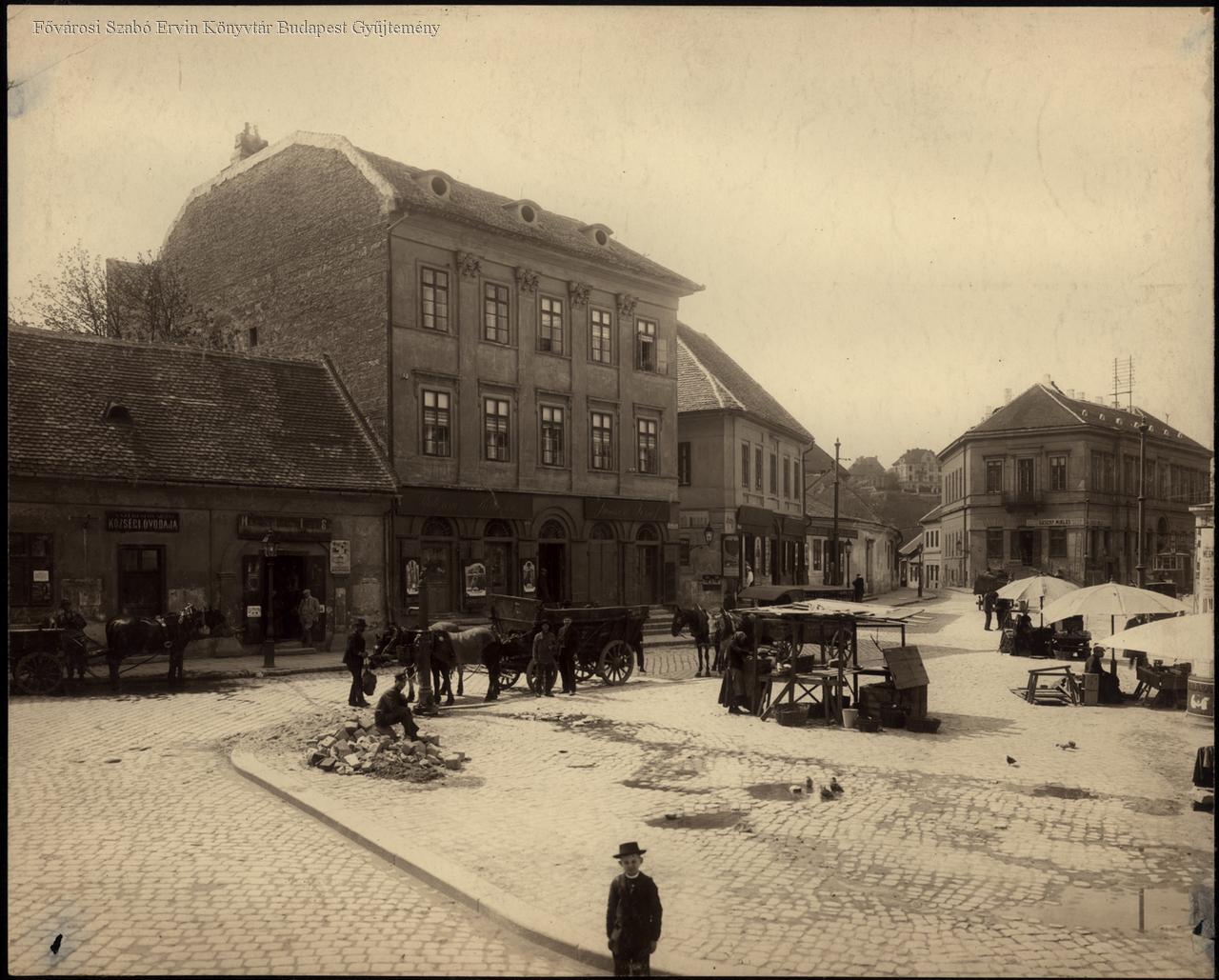lakóépület, piac, óvoda, lovas kocsi, kereskedő, kút, üzlet, utcakép, életkép, 1910 körül