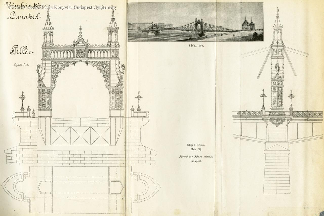 Feketeházy János II. díjat nyert terve. híd távlati képe Buda felől, metszet, pillér, távlati kép