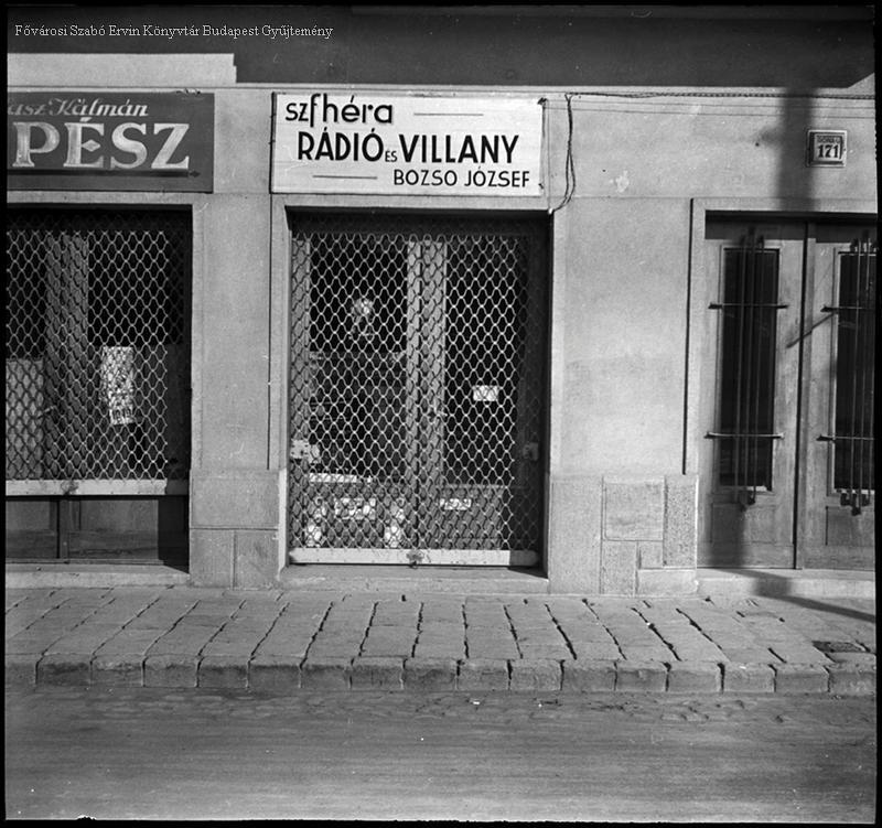 [Műhelyek, lehúzott rolóval] [az egyiken felirat: Szfhéra, rádió és villany, Bozsó József]