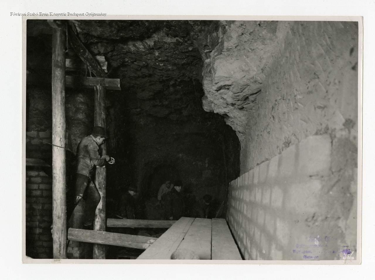 kórház, óvóhely, föld alatti létesítmény, bunker, barlang, pince, alagút, építés, munkavégzés, fizikai munka, munkavégzés különleges körülmények között, mélyépítés, alagútépítés, kőművesmunka, munkás, állvány, tégla, légoltalom, polgári védelem, második világháború, 1930-as évek, 1940-es évek, 1939-1943