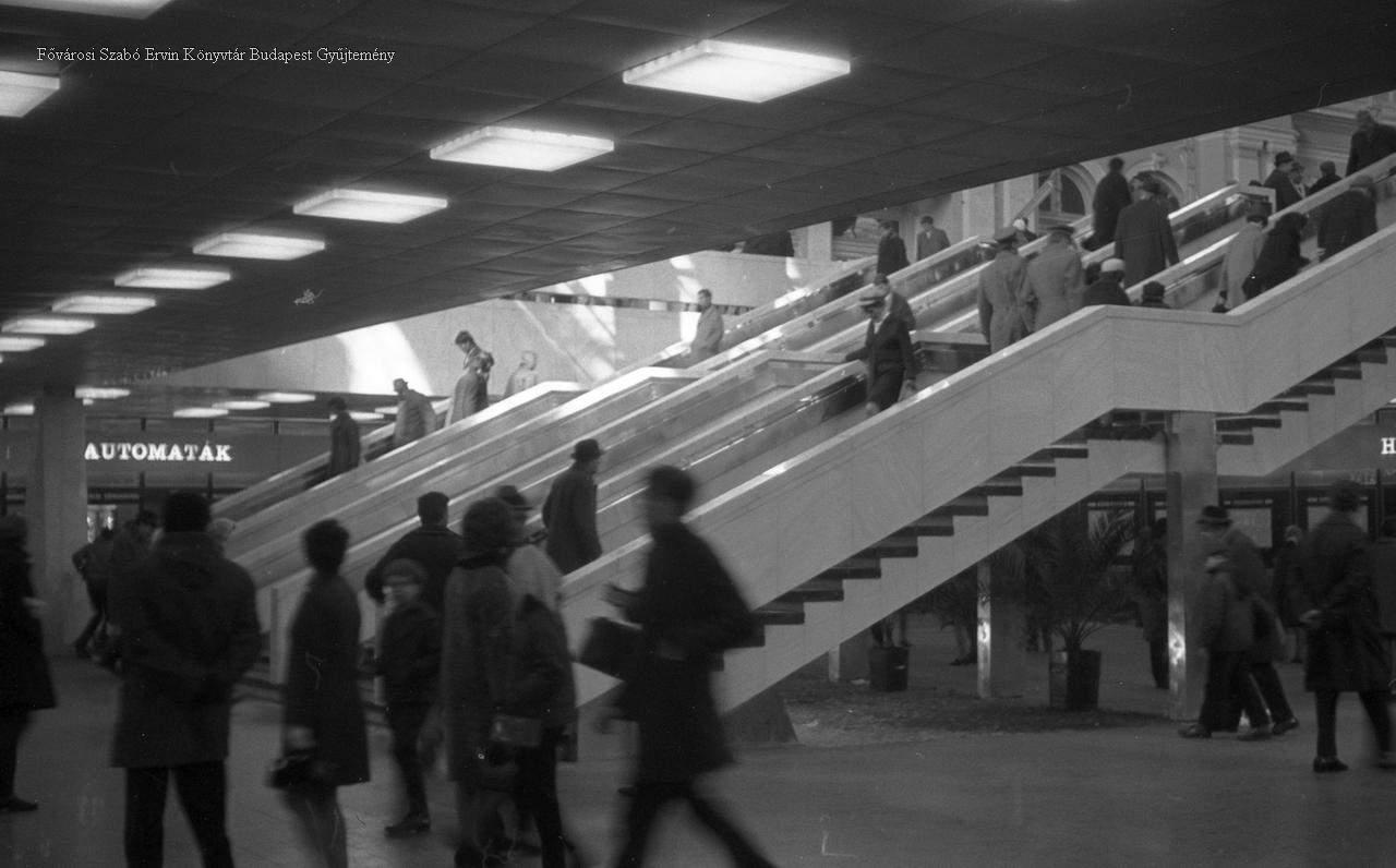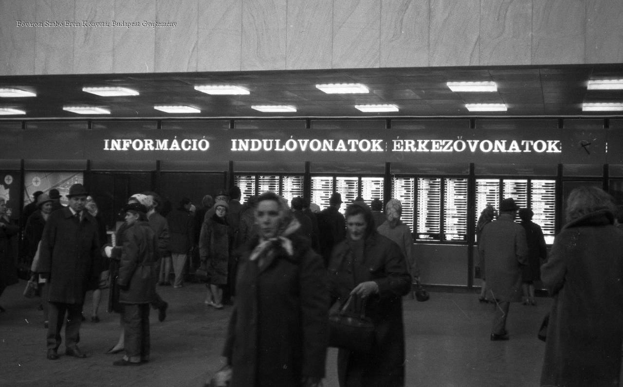 külső felvétel, belső felvétel, épületkép, utcakép, pályaudvar, vasút, közlekedés, ember, lépcső, óra, tájékoztató, kijelző, 1970-es évek