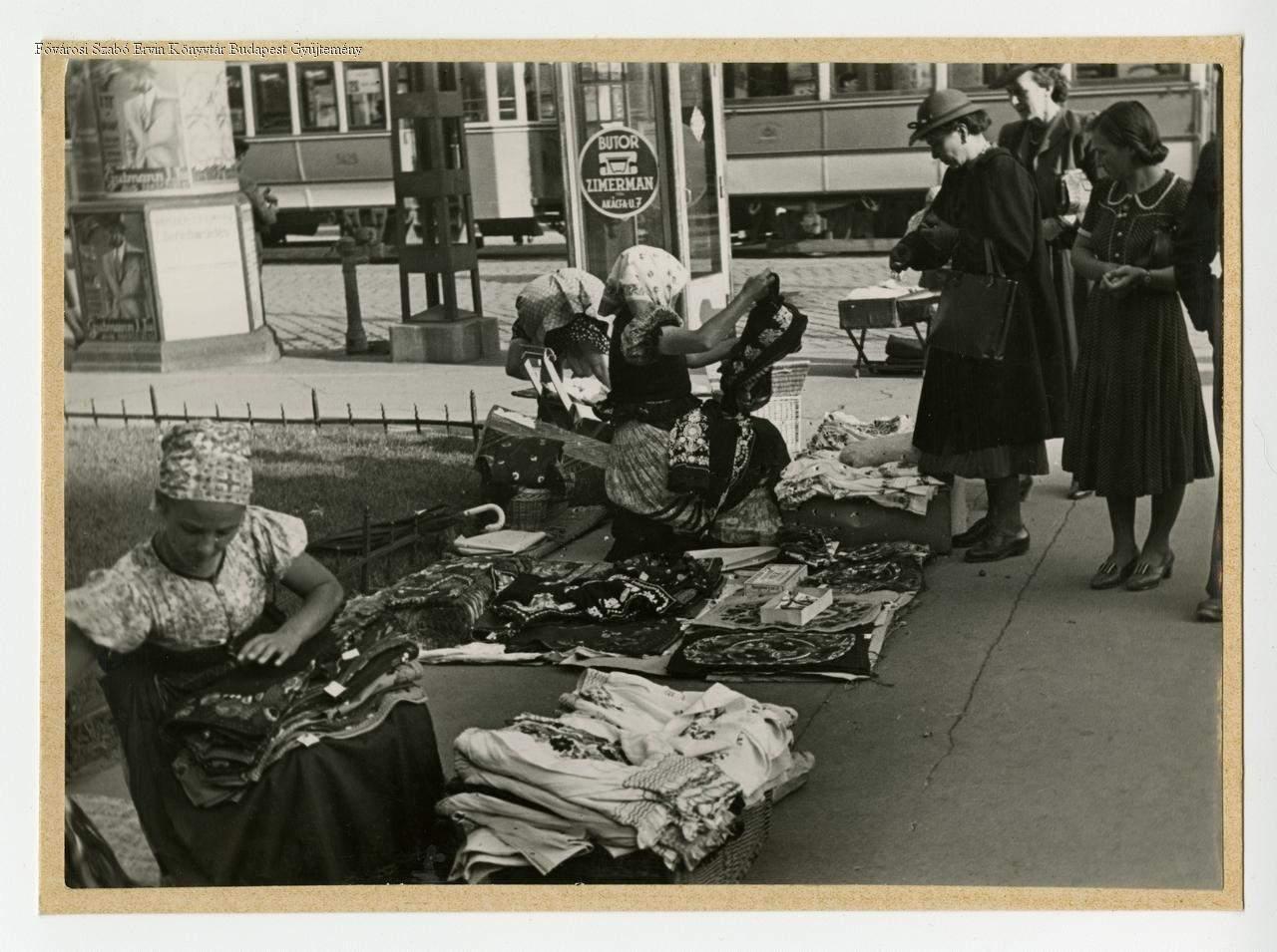 [Matyó kézimunkákat áruló utcai árusok és vevőik a Nemzeti Színház előtt]