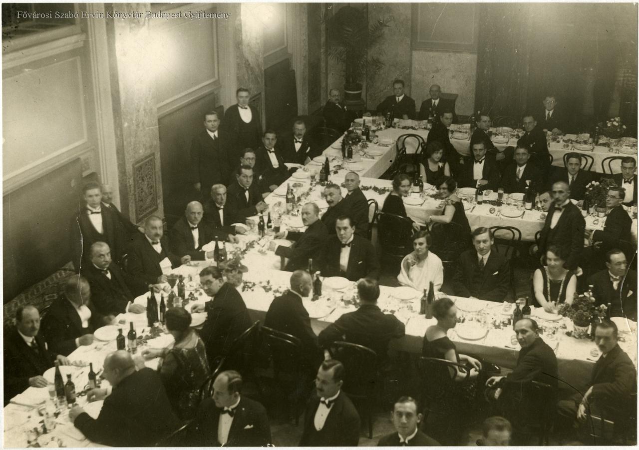 társaság, bankett, férfi, nő, pincér, asztal, tányér, pohár, üvegpalack, támlásszék, csoportkép, sajtófotó, belső felvétel
