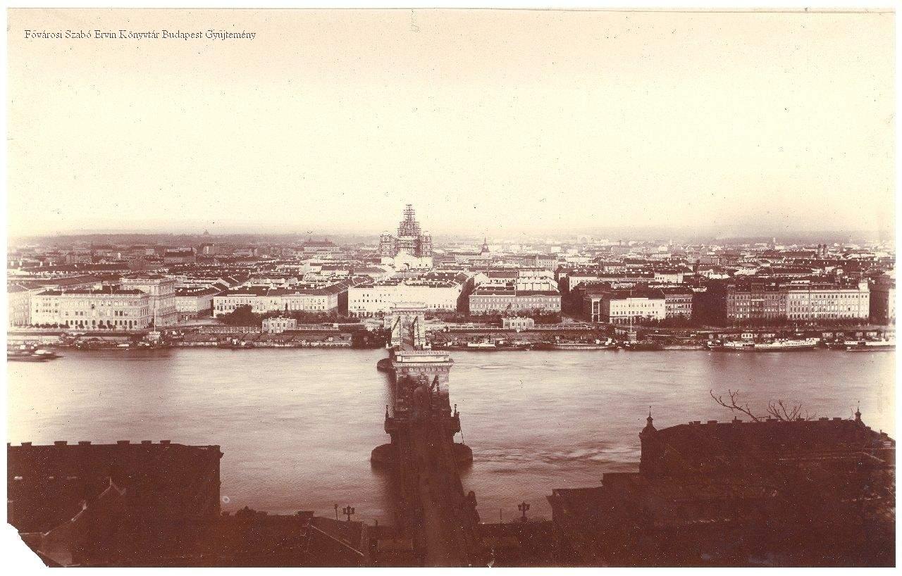 A kép a várból a Lánchíd tengelyében készült. Jól látható a Ferenc József tér minden épülete, előtte a rakparti bódék, raktárak, hajók. Már áll a Deák-szobor. A Bazilika még felállványozva. (1890 előtt)