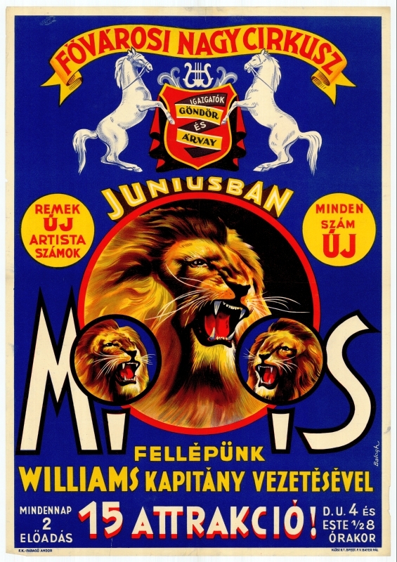 A Fővárosi Nagycirkusz előadásait hirdető plakát. A cirkusz Williams kapitány vezetésével lép fel júniusban, 15 attrakcióval. A plakát napi két előadásról tájékoztat délután 4 és este fél 8 órakor. A plakátot oroszlán és ló ábrázolások díszítik.