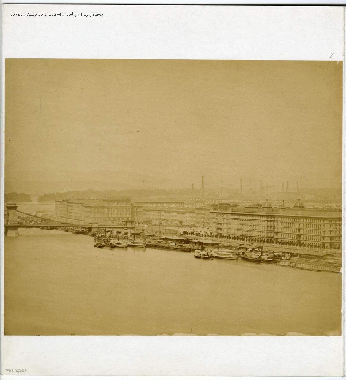 Balra a Dunán átívelő Széchenyi lánchíd, középen a pesti oldal lakóépületei, a rakpart mellett hajók várakoznak, távolban gyárkémények