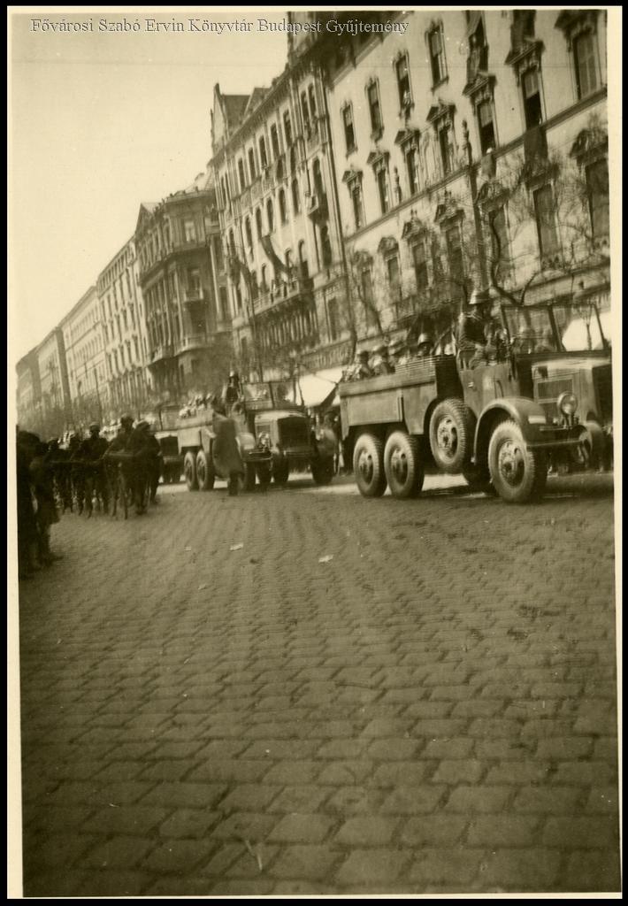 [Katonák szállítójárműveken és kerékpárokkal a Nagykörúton, indulóban a frontra a gyorshadtest
