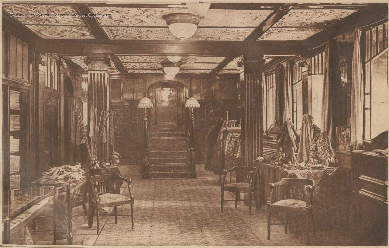 A Sugár és Barna cégnek, a főváros legelőkelőbb úridivatüzletének és úriszabó-műtermének díszes, ízléssel berendezett enteriőrje (VI., Teréz körút 6.)