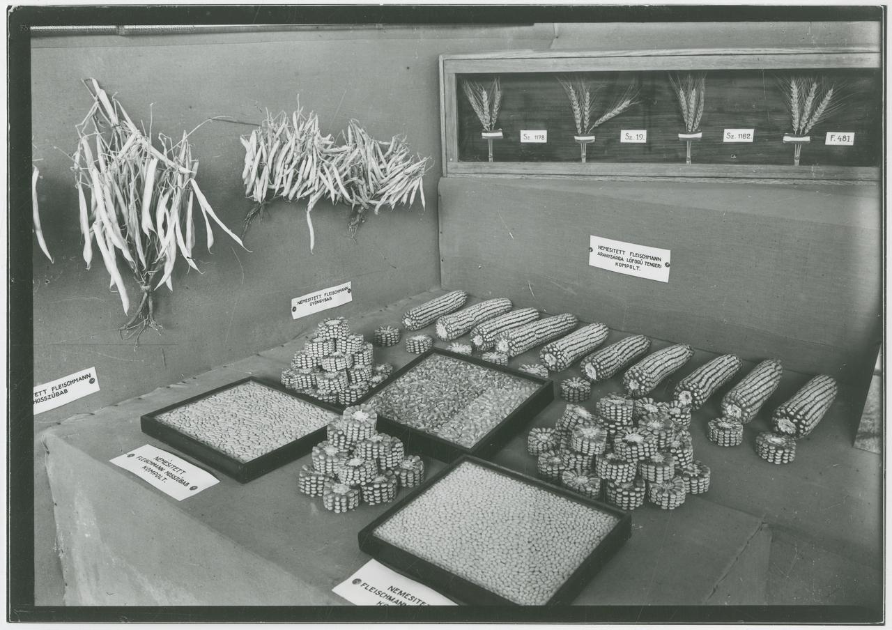 vásár, mezőgazdasági kiállítás, árubemutató, növénynemesítés, kukorica, kiállítási épület, belső felvétel, 1934