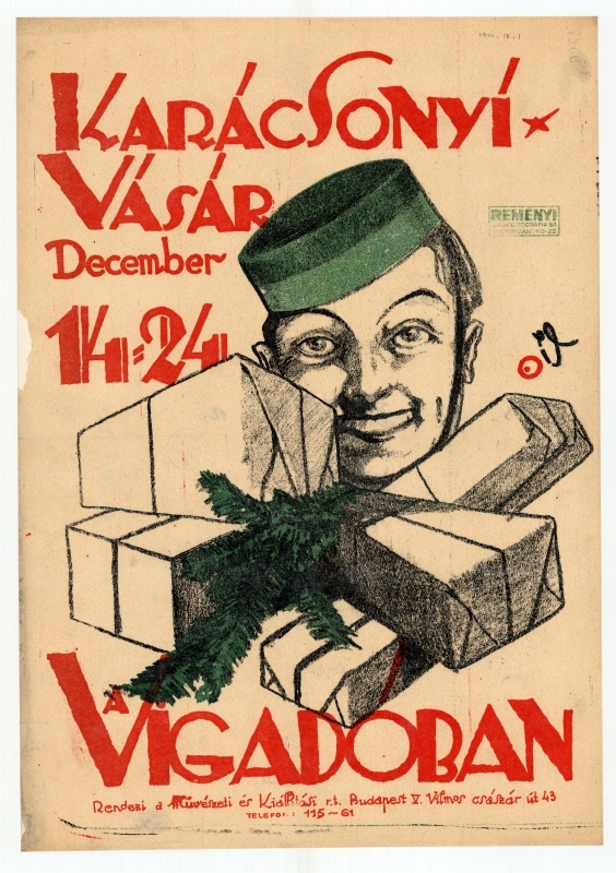 A Pesti Vigadóban megrendezett karácsonyi vásárt hirdető plakát. A vásár december 14-24 között volt megtartva. Rendezte a Művészeti és Kiállítási r.t.. A képen ajándékdobozok láthatóak, fenyőágakkal és egy londíner arcával a háttérben.