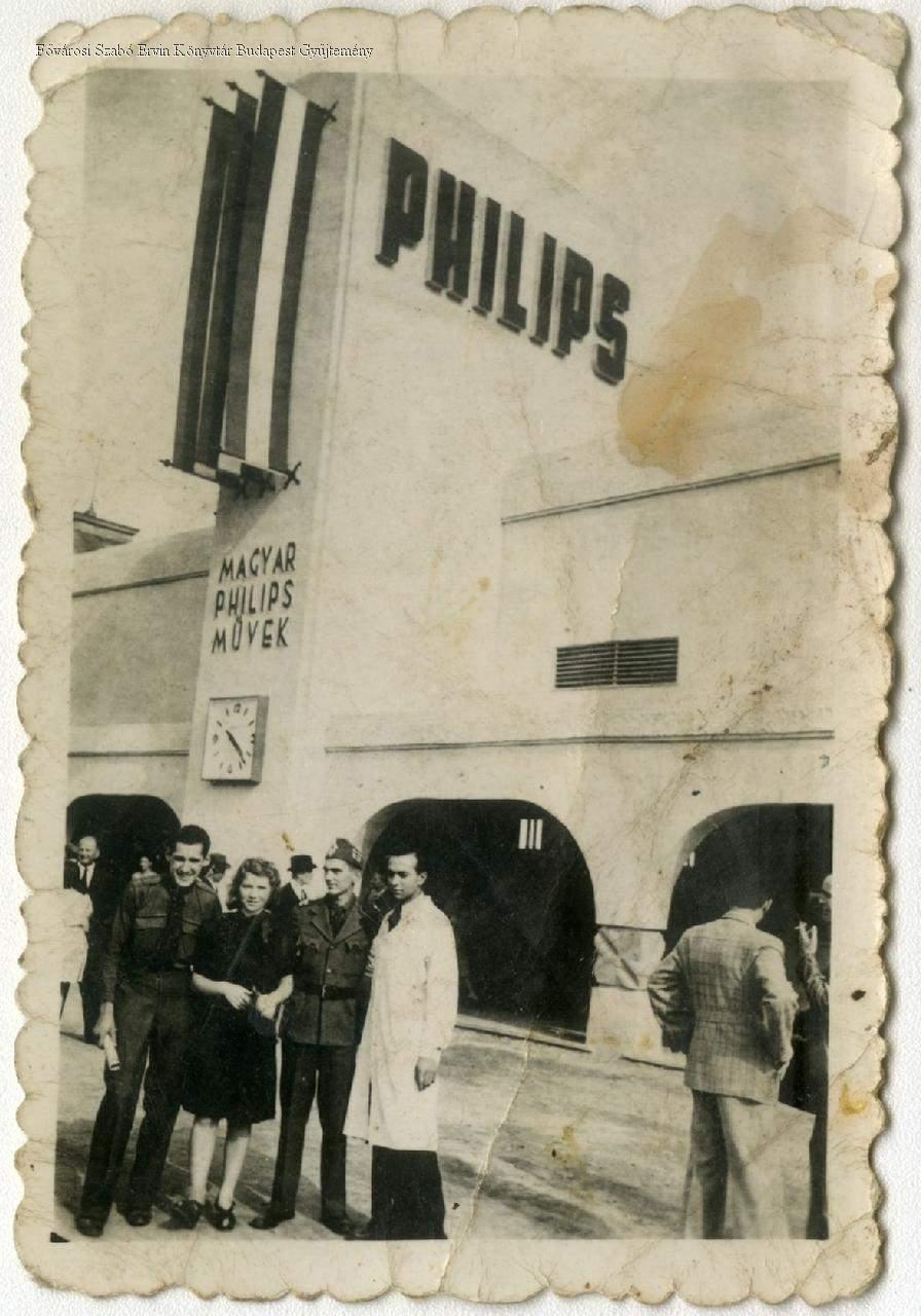 [Csoportkép a Magyar Philips Művek kiállítóhelye előtt a Városligetben, a Budapesti Nemzetközi Vásáron]