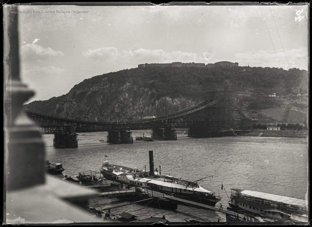 [Az épülő Eskü téri híd Pest felől] [Construction of the Eskü Square/Erzsébet Bridge from Pest]