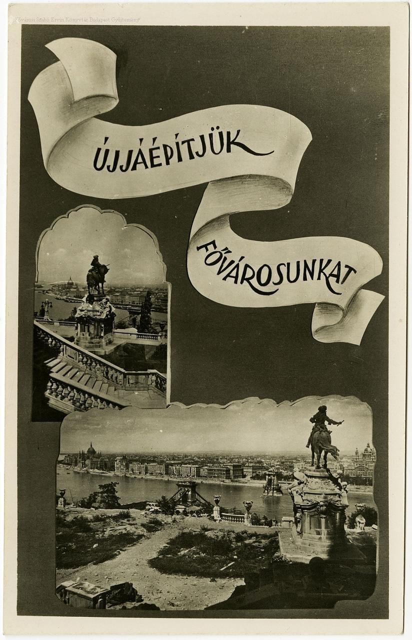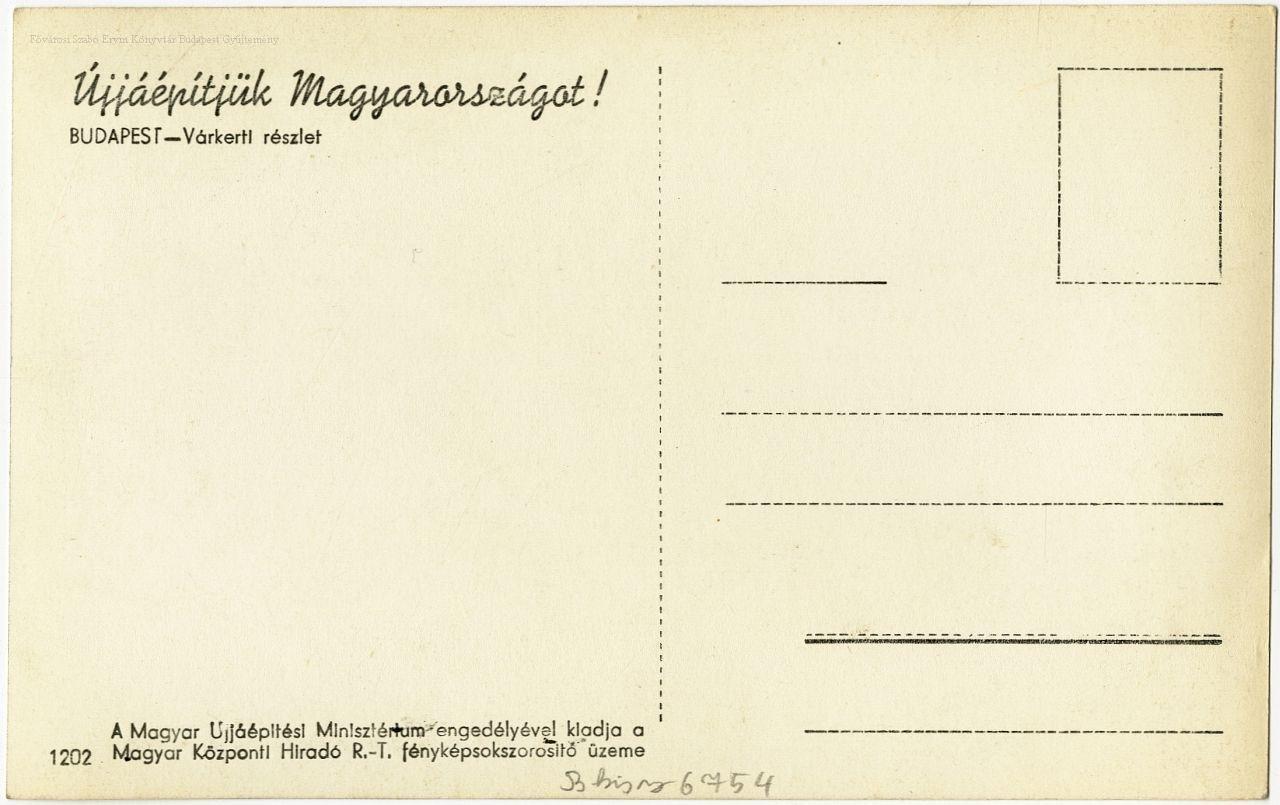 Kiadási adat a képeslapon: A Magyar Ujjáépítési Minisztérium engedélyével kiadja a Magyar Központi Híradó R.-T. fényképsokszorosító üzeme