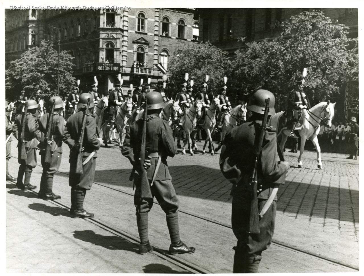 III. Viktor Emánuel, olasz király látogatása Budapesten: lovas testőrség felvonulása a Teréz körúton