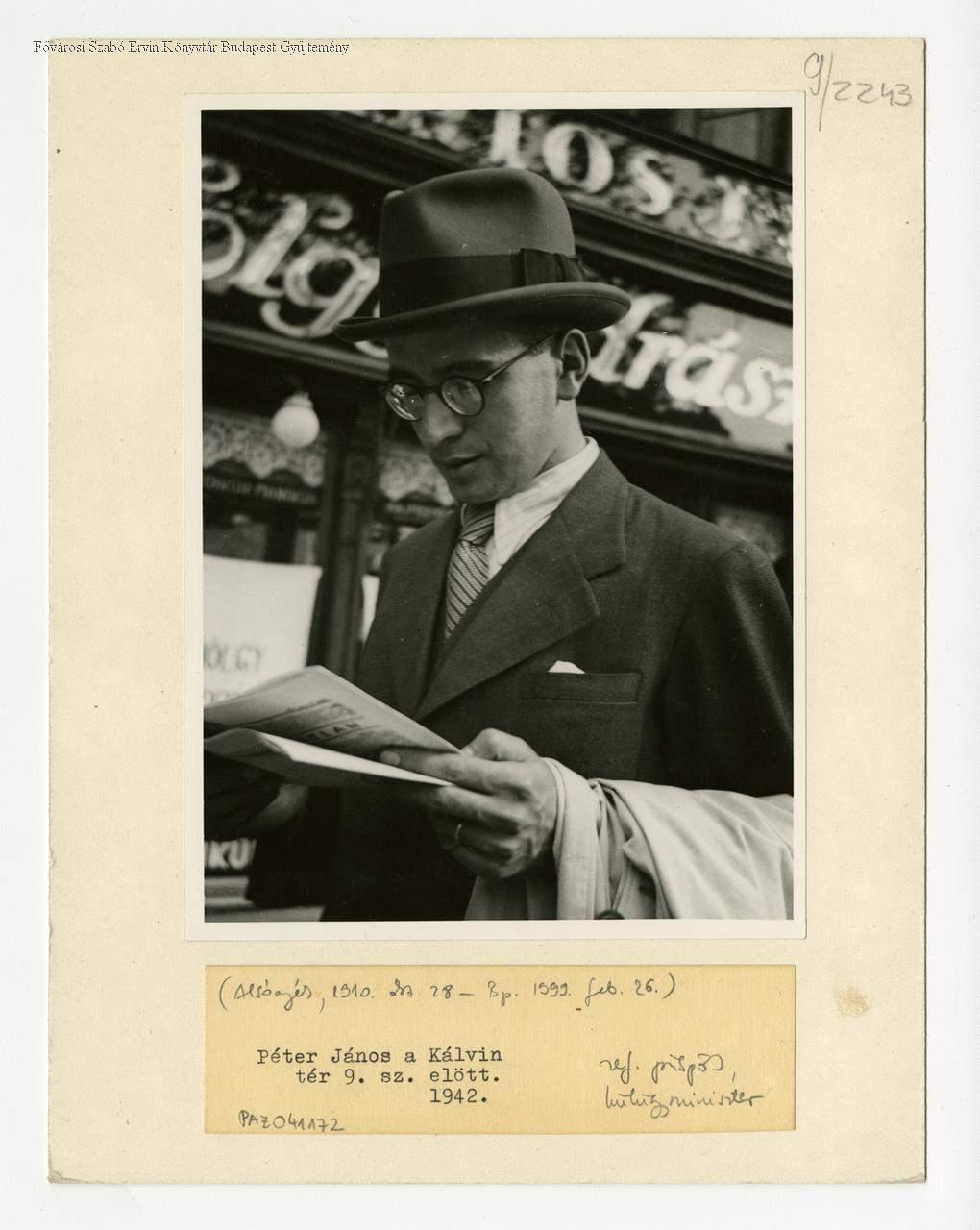 [Péter János református lelkész, a későbbi politikus, újságot olvasva a Kálvin tér 9. számú ház előtt]