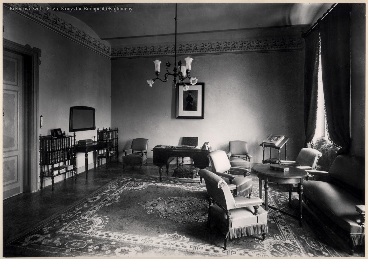 Dolgozószoba és társalgó. Szecessziós csillár, sötétítőfüggöny, perzsaszőnyeg. Ülőgarnitúra, íróasztal, könyvespolc, lábzsámoly. Benczúr Erzsébet királynét ábrázoló festménye (1899)