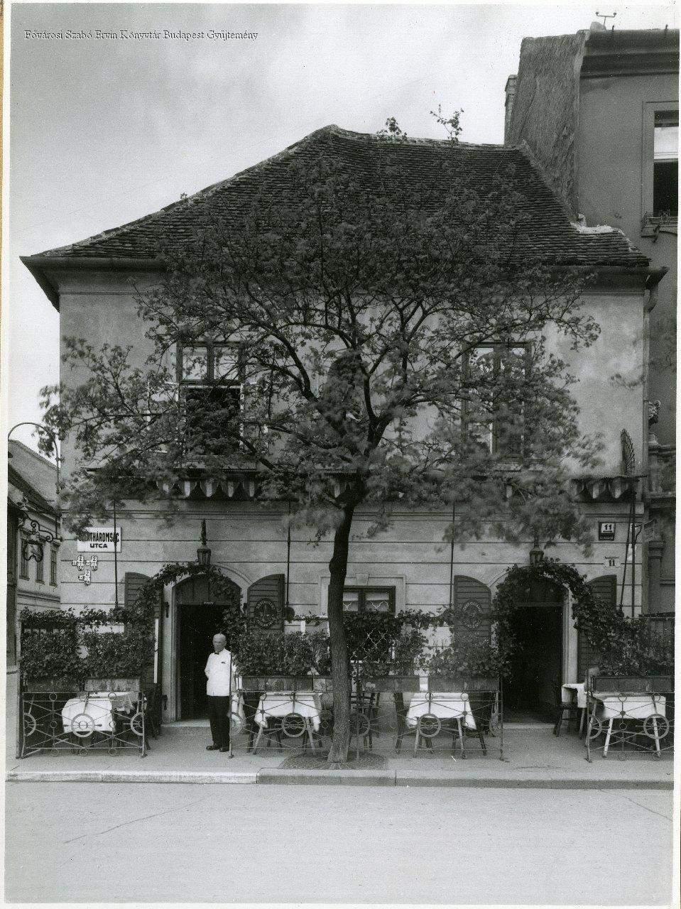 vendéglátás, étterem, pincér, fa, cégtábla, bejárat, asztal, támlásszék, terítő, külső felvétel