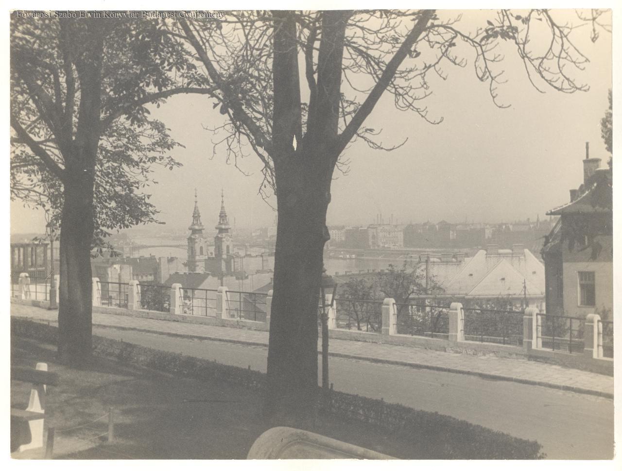 Kilátás a Batthyány tér felé a Várhegy oldalából, egy Hunyadi János út melletti játszótér sarkából. Vizivárosi háztetők. A Duna túlpartján a Jászai Mari tér és a Parlament közötti házsor körvonalai