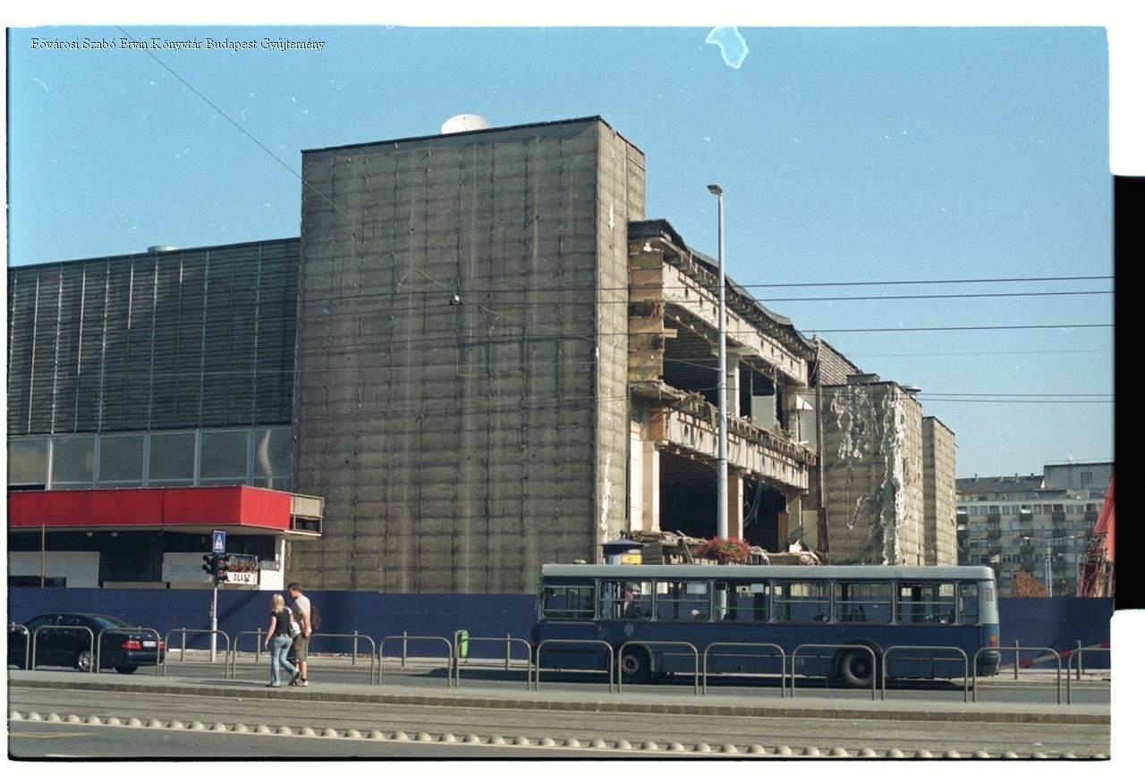 külső felvétel, épületkép, utcakép, áruház, épületbontás, munkagép, ember, személygépkocsi, autóbusz, 2000-es évek