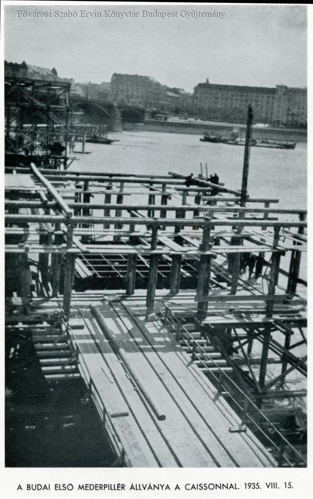 [A Margit híd átépítése, 1935-1937] A budai első mederpillér állványa a caissonnál : 1935. VIII. 15.