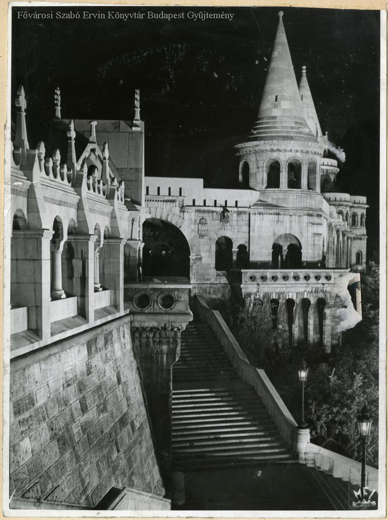 szobor, bástya, neoromán, műemlék, lámpa, este, éjjel, 1930-as évek