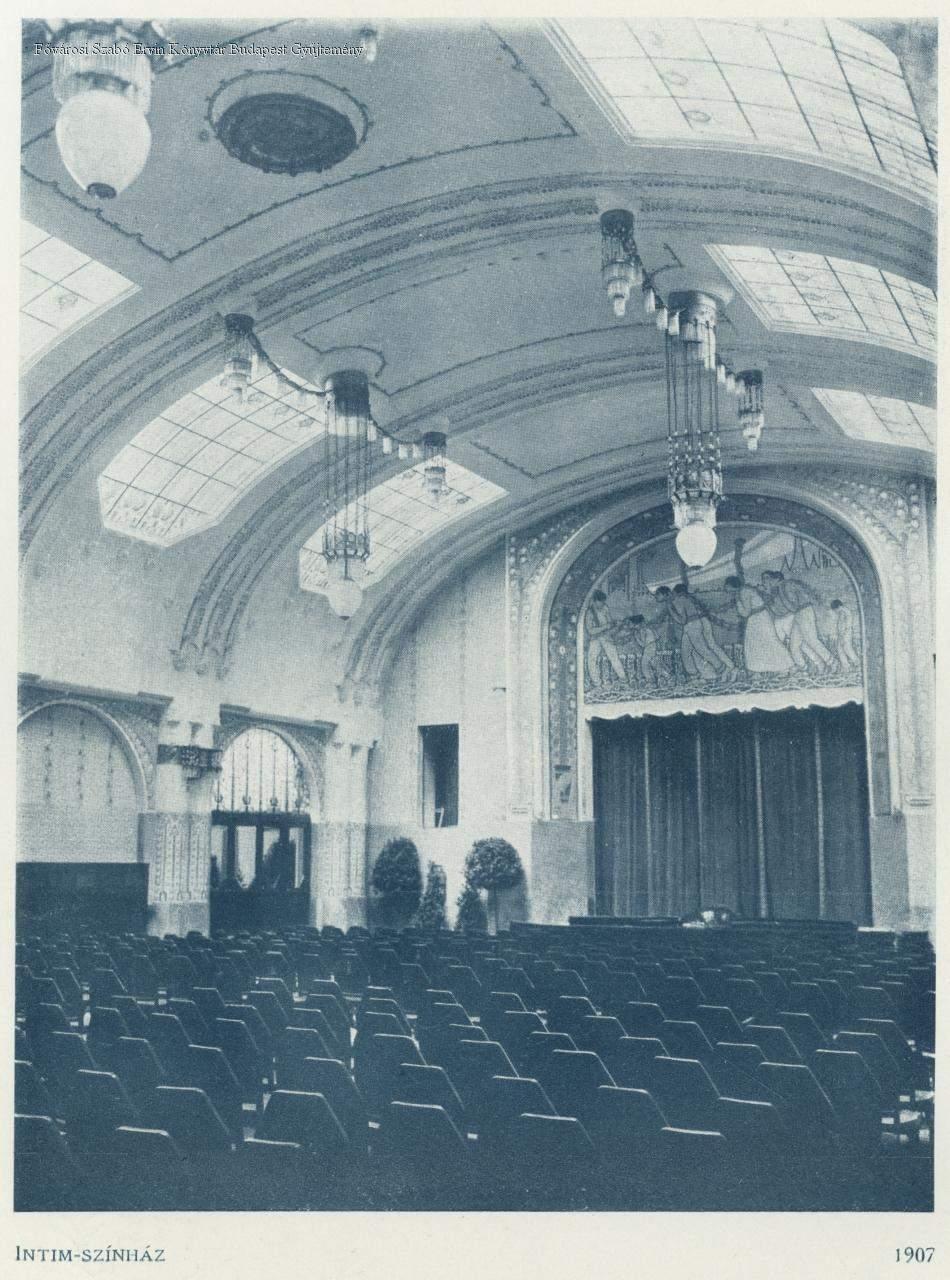 Az épület főhomlokzata a tér felől, 1906. A színpad, nézőtér, mennyezetrózsa, belső tér, 1907. [Zord Arnold] és Kiss Rezső falfestményei. Bejárat, 1906