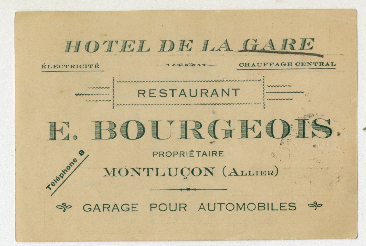 Électricité, Chauffage central, Restaurant E. Bourgeois propriétaire Motlucon (Allier). Téléphone B.