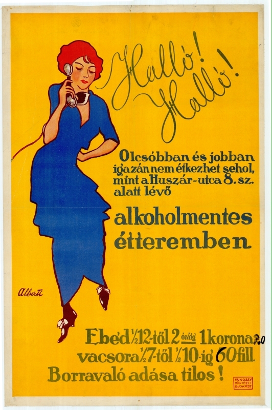 A Huszár utca 8. szám alatt levő alkoholmentes étterem reklámplakátja. A plakáton sárga háttér előtt kék ruhás telefonáló hölgy látható "Halló! Halló!" felirattal.