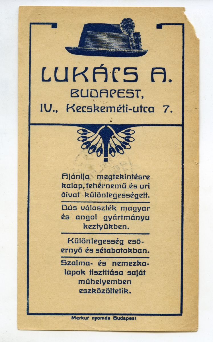 Ajánlja megtekintésre kalap, fehérnemű és úri divat különlegességeit. Dús választék magyar és angol gyártmányú kesztyűkben. Különlegesség esőernyő és sétabotokban. Szalma- és nemezkalapok tisztítása saját műhelyemben eszközöltetik.