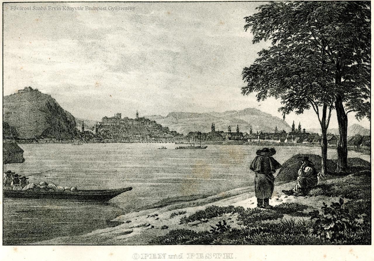 Buda és Pest látképe a ferencvárosi Dunapartról. Déli nézet. Előtérben két parasztruhás férfi. Háttérben a Gellérthegy, a Várhegy, jobbra Pest