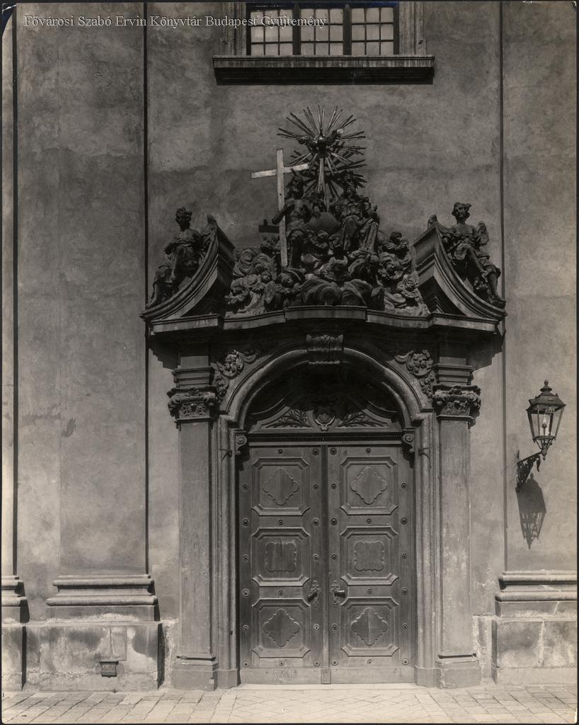 [Belvárosi főplébániatemplom kapuzata, felette a Szentháromság-szobordísz]