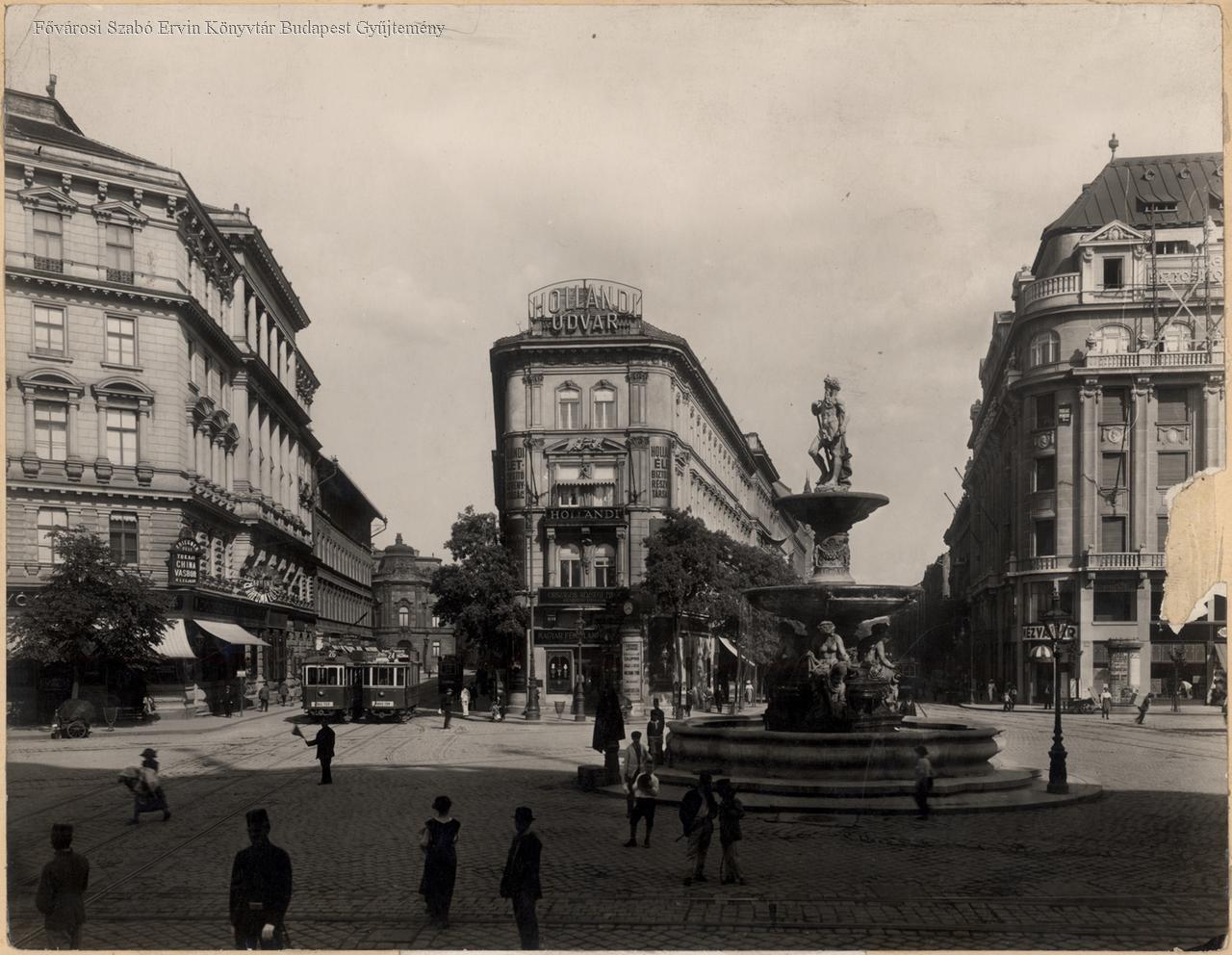 bérház, biztosításügy, bank, hirdetőoszlop, szökőkút, ember, köztéri óra, villamos kocsi, közlekedési dolgozó, utcakép, 1913 körül