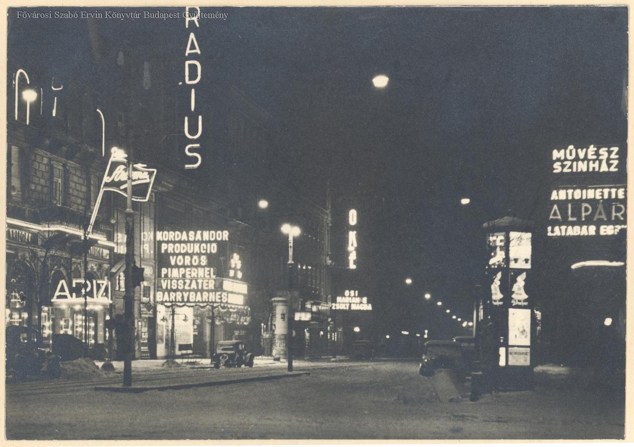 színház, filmszínház, fényreklám, neon, hirdetés, utcakép, esti felvétel, 1938
