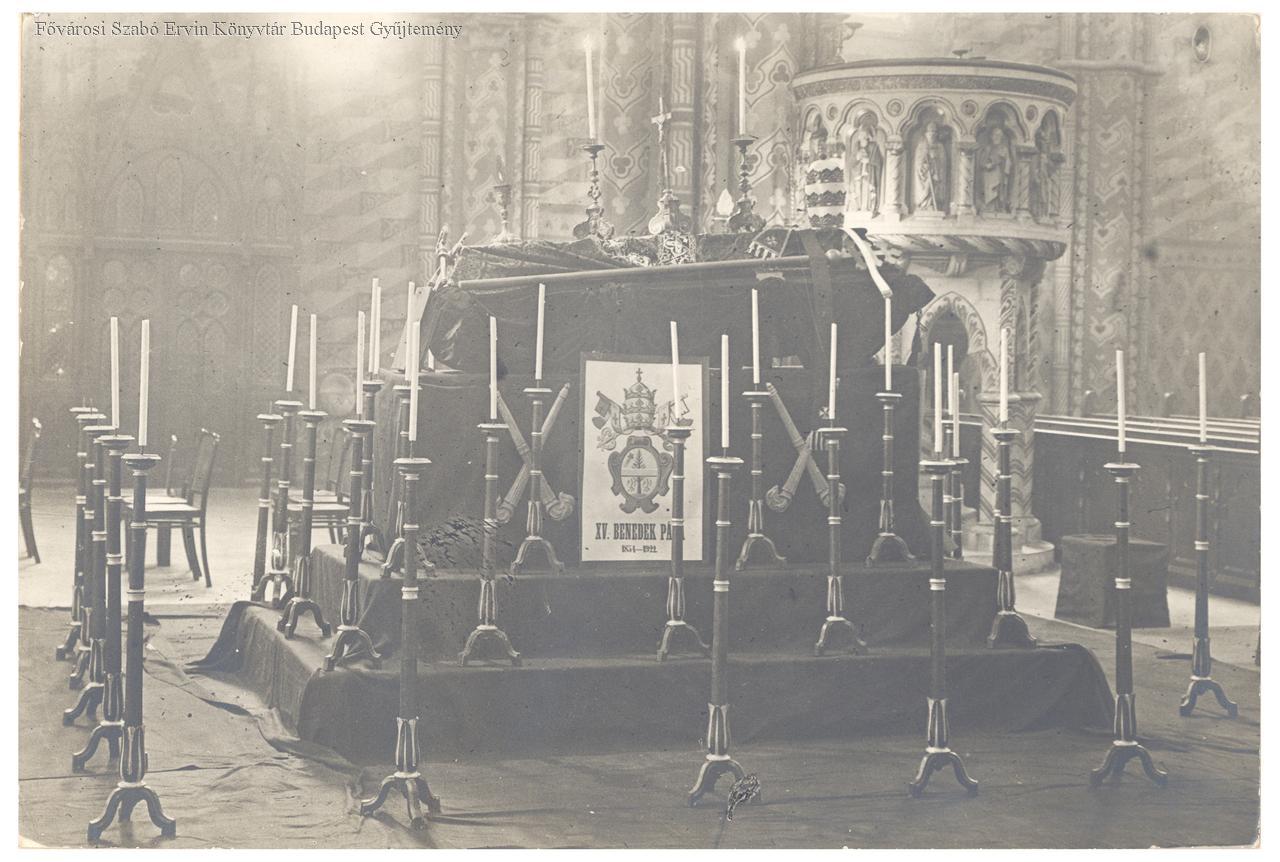 [Gyászmise a Mátyás templomban. Szimbolikus katafalk XV. Benedek pápa halálakor]