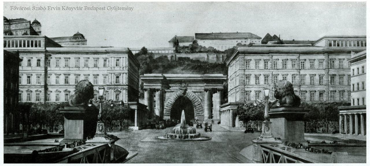 A tervezett térkialakítás a Lánchídról nézve, középen szökőkút, szemben az Alagút bejárata. Nem