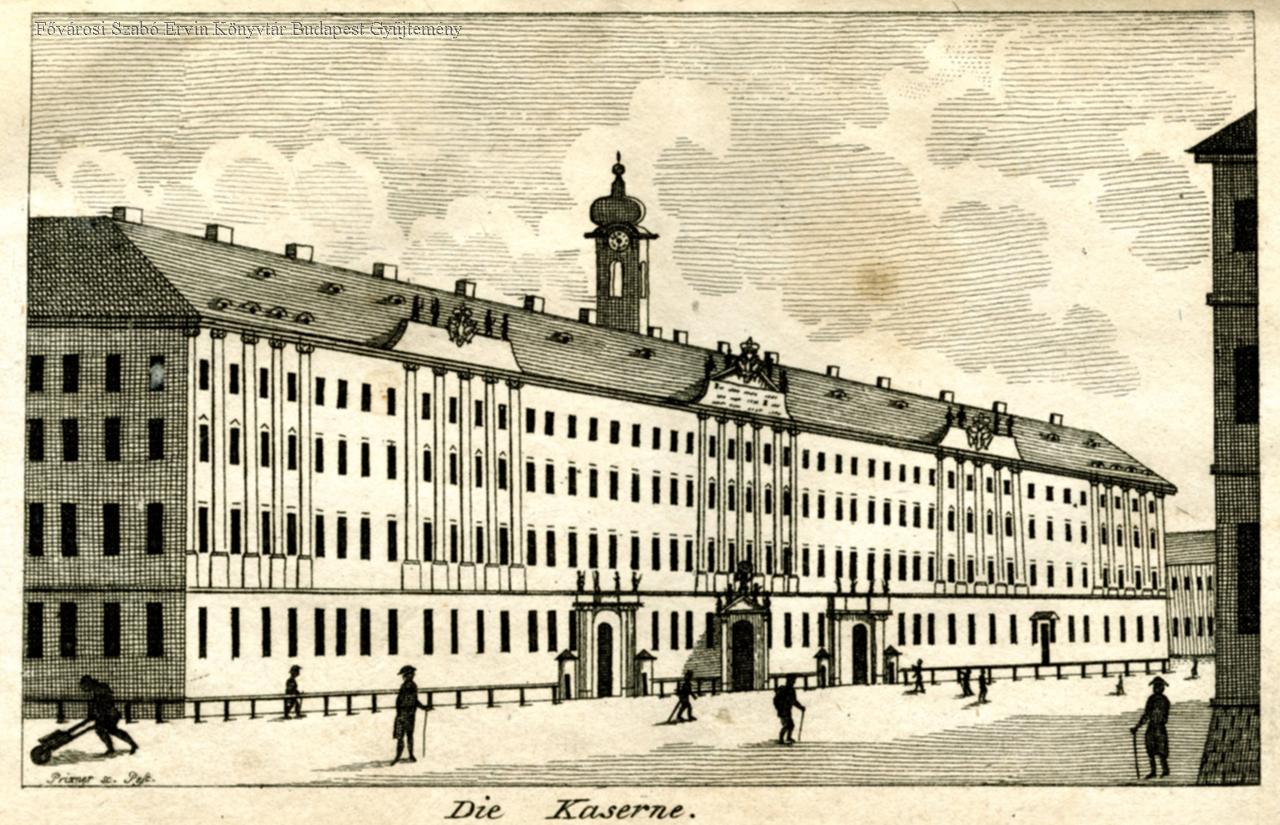 A Károly-kaszárnya képe, az előtérben alakokkal