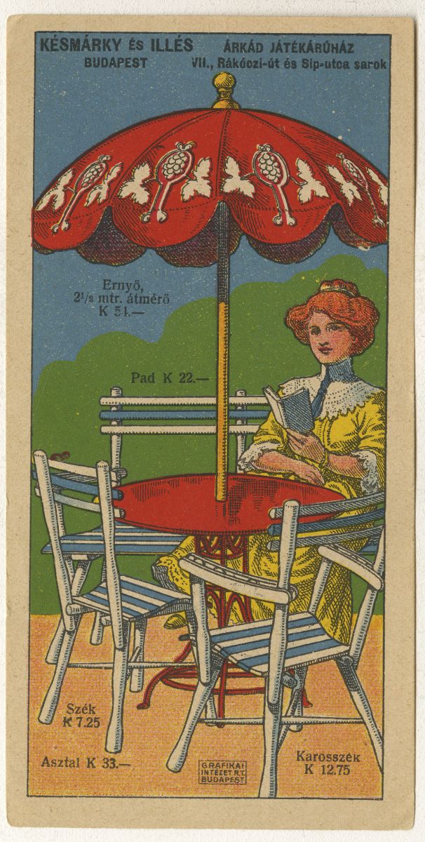 6. Kép: ernyő 2 1/2 mtr. átmérő K 51.-, pad K 22.-, szék K 7.25.-, asztal K 33.-, Karosszék K 12.75.-