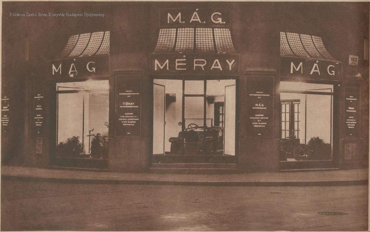 [A M. Á. G. autók és Méray motorkerékpárok kiállítási helyiségének portálja éjjeli világításban