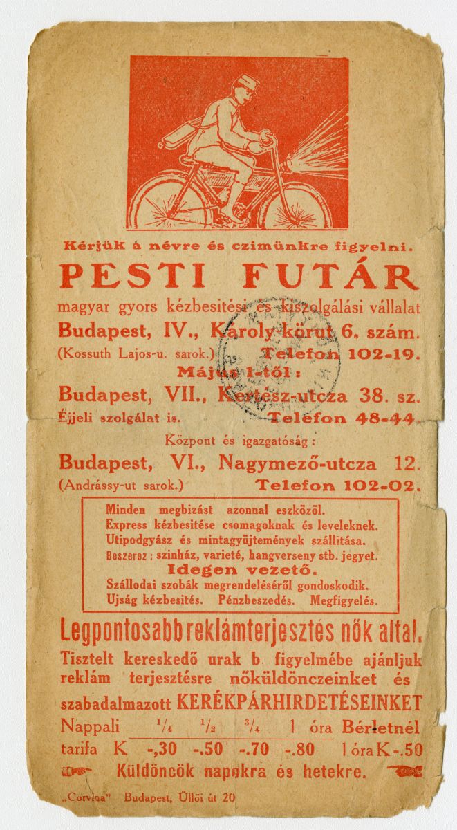 futár, futárszolgálat, küldeménykihordó, üzenetközvetítés, szállítás, rendezvényszervezés, kerékpár, kézbesítés, hirdetés, küldönc, csomag, levél, idegenvezető, pénzbeszedés, megfigyelés, színházjegy, női munka, reklámnyomtatvány, kisnyomtatvány, aprónyomtatvány, számolócédula