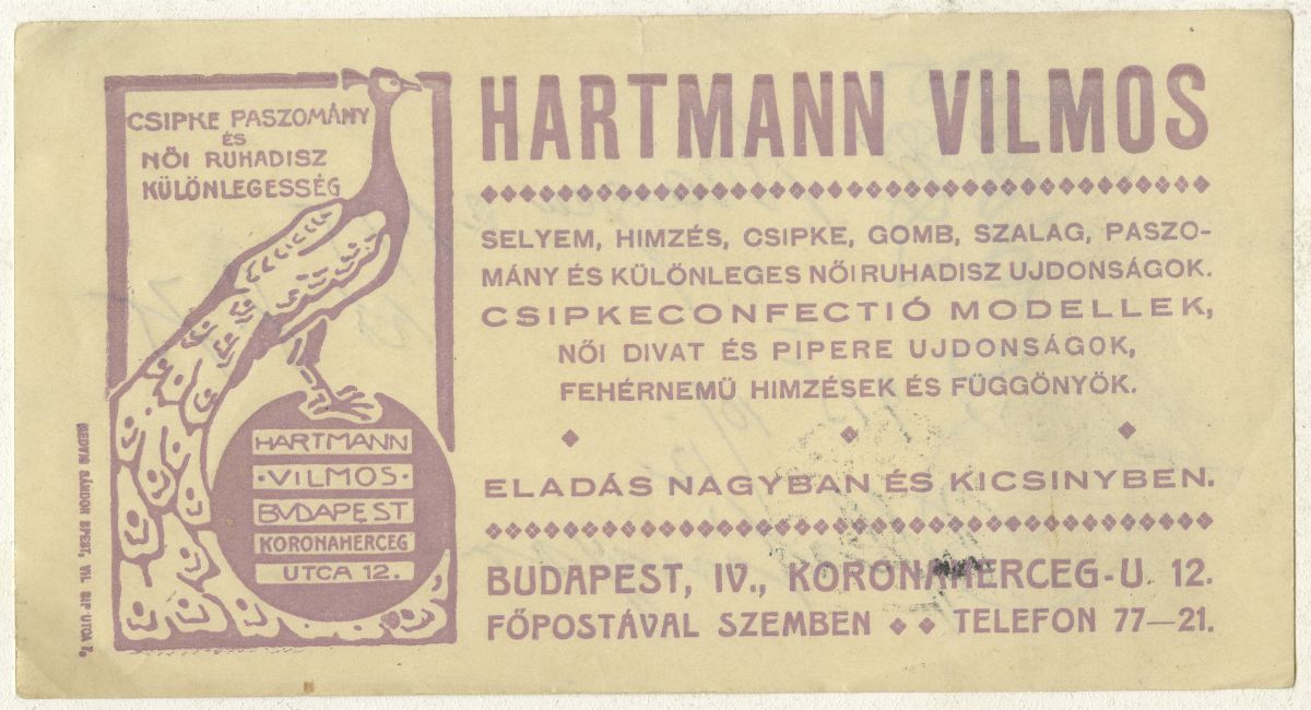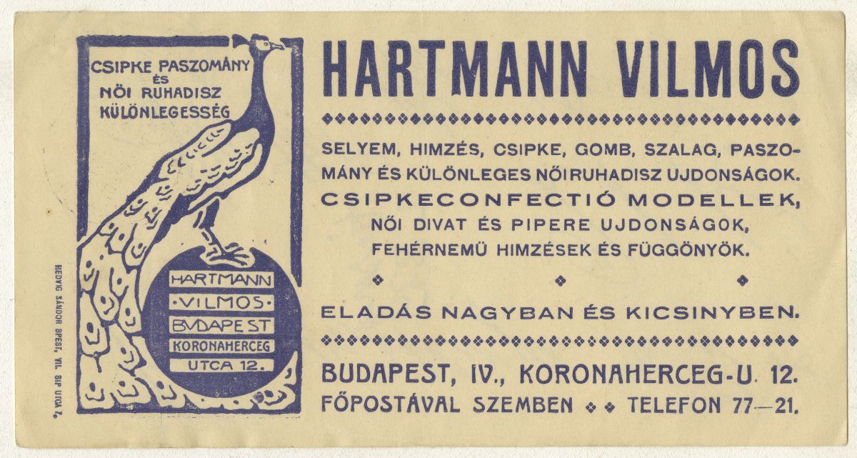 páva, ruhakellék, öltözetkiegészítő, csipke, függöny, hímzés, reklámnyomtatvány, kisnyomtatvány, aprónyomtatvány, számolócédula